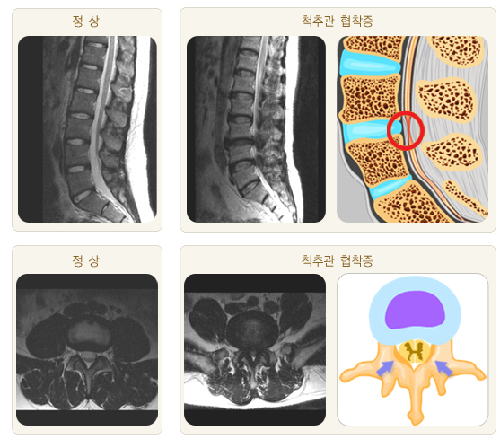 척추 안쪽의 신경 통로가 좁아져 신경을 누르는 병입니다.