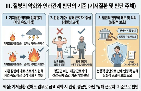 특히 기존 질병이 자연적인 진행 속도보다 빠르게 악화된 경우라면 인과관계가 인정될 가능성이 높습니다.