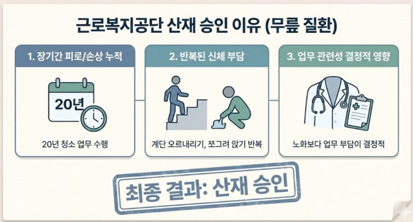 이번 사례의 재해자는 약 20년 동안 건물 청소 업무를 수행해 왔으며, 업무를 하면서 지속적으로 무릎 통증을 경험해 왔습니다. 시간이 지날수록 통증이 심해졌고 특히 계단 이동이나 걸레질 작업을 할 때 통증이 급격히 악화되었습니다. 병원 진료 결과 슬관절 퇴행성 관절염 진단을 받았고 결국 양쪽 무릎에 인공관절 수술을 받게 되었습니다.