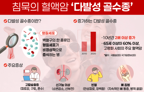 다발성골수종은 면역 기능을 담당하는 형질세포가 비정상적으로 변형되어 발생하는 혈액암입니다.