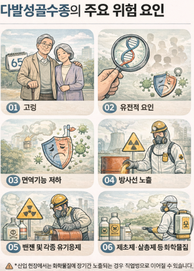 현재까지 다발성골수종의 정확한 발병 원인은 명확하게 밝혀지지 않았습니다.