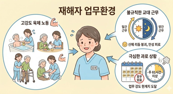 재해자는 노인복지시설에서 근무하며 주야 2교대 형태로 어르신 돌봄 업무를 수행해 왔습니다.