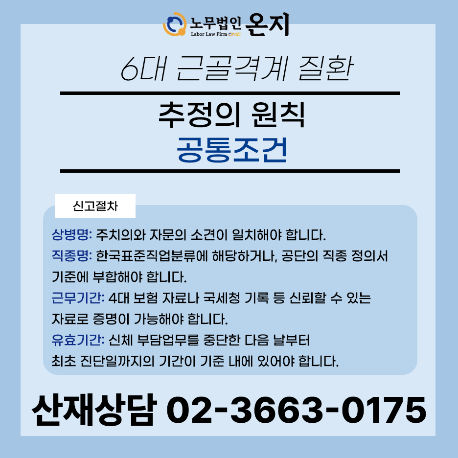 최근 근로복지공단에서는 근골격계 질환과 관련해 판정 사례 및 외국 기준을 분석하고, 2019년부터는 업무관련성 평가 시 ‘추정의 원칙’을 적용하고 있습니다. 오늘은 이 ‘추정의 원칙’이 무엇인지, 어떤 기준이 적용되는지 함께 살펴보겠습니다.